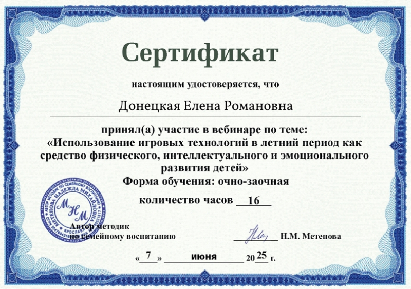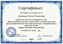 Сертификат участника вебинара по теме "Использование игровых технологий в летний период как средство физического, интеллектуального и эмоционального развития детей"