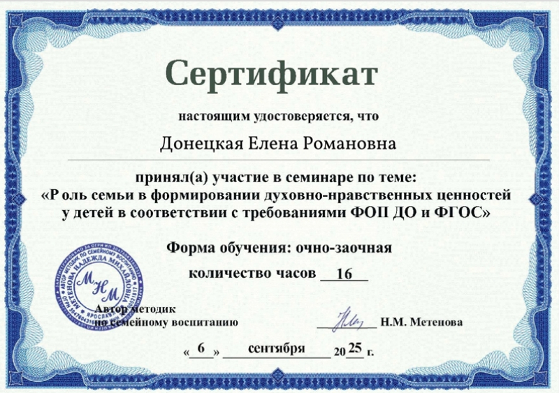 Сертификат участника семинара по теме "Роль семьи в формировании духовно-нравственных ценностей у детей в соответствии с ФОП ДО и ФГОС
