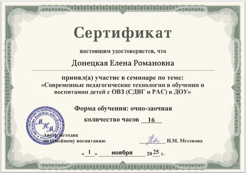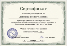 Сертификат участника семинара по теме "Современные педагогические технологии в обучении и воспитании детей с ОВЗ (СДВГ и РАС) в ДОУ"