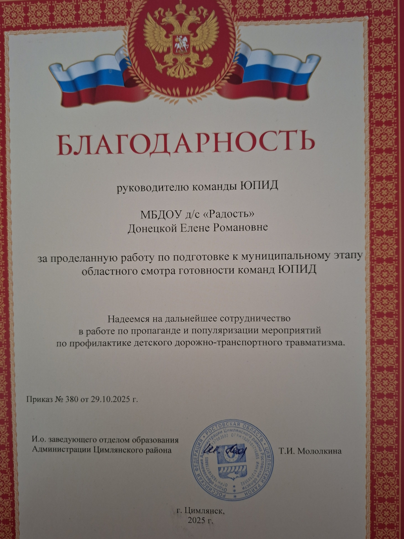Благодарность руководителю команды ЮПИД за проделанную работу в подготовке к муниципальному этапу областного смотра готовности команд ЮПИД