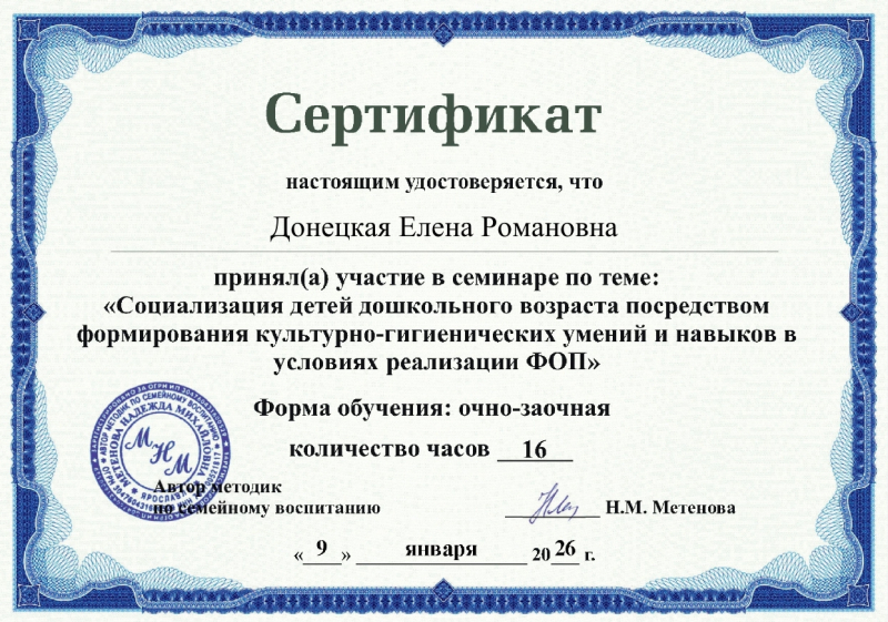 Сертификат участника в семинаре по теме: "Социализация детей дошкольного возраста посредством формирования культурно-гигиенических умений и навыков в условиях реализации ФОП"